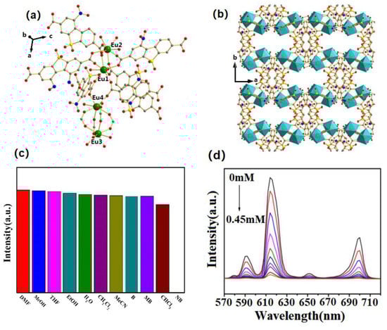 Nitrobenzene (NB), as the simplest nitroaromatic compound, is widely used in the synthesis of many products in industry, and leads to air, water, and soil pollution, as well as serious safety problems. Moreover, since NB is highly toxic, difficult to degrade, carcinogenic, and easy to settle, once it is exposed to groundwater and soil, it will have adverse effects on human health and the environment. The rapid and sensitive detection of NB is a crucial task; thus, many approaches have been developed for NB detection, such as chromatography, spectrophotometry, electrochemical method, and so on [37]. However, these methods are complex, expensive, and time-consuming. Many lanthanide complexes can be used as fluorescence materials to detect NB through the alteration in fluorescence properties and, usually, show high sensitivity and selectivity, due to NB inducing fluorescence quenching of lanthanide complexes in various organic solvents. As shown in Figure 7, a 3D Eu–organic complex {[Eu2(NSBPDC)3(H2O)4]·7(H2O)}n (H2NSBPDC = 6-nitro-2,2′-sulfone-4,4′-dicarboxylic acid), as a fast and recyclable fluorescence sensor, exhibited good fluorescence sensing on NB via a turn-off response with a low detection limit of 11.315 μM [60].