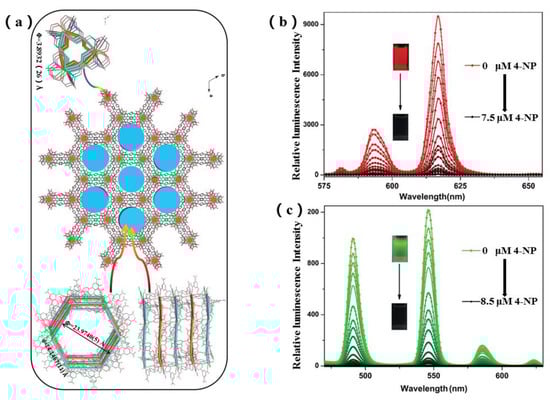 (a) The 3D molecular structure of {[Tb(HL)]·3DMF·3H2O}n (LZG-Tb) showing the Tb4C3O6 subunit and chair conformational hexagon cavity viewing along c-axis (color modes: green, Tb; red, O; blue, N; gray, C); (b) the luminescence response of {[Eu(HL)]·3DMF·3H2O}n (LZG-Eu) to different concentrations of 4-NP (0–7.5 μM) in deionized water; (c) the luminescence response of LZG-Tb to different concentrations of 4-NP (0–1 μM) in deionized water. Adapted with permission from Ref. [63], 2021, The Royal Society of Chemistry.