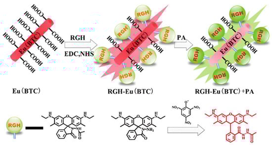 The synthetic protocol of RGH–Eu(BTC) and its principle for TNP (or PA) detection. Adapted with permission from Ref. [67], 2017, The Royal Society of Chemistry.