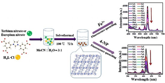 Schematic representation for the synthesis of complexes [EuxTb1-x(L)(H2O)3]n and detection of Fe3+ cation and 4-NP through fluorescence quenching effect. Adapted with permission from Ref. [56], 2020, The Royal Society of Chemistry.