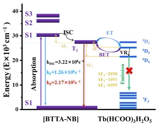 Energy level diagram depicting the most likely sensitization and emission processes for [Tb(BTTA)1.5(H2O)4.5]n/NB. Intersystem crossing, phosphorescence, and fluorescence rates are represented by the letters kISC, kP, and kF, respectively, while ET stands for energy transfer and BET is back energy transfer (BET). Adapted with permission from Ref. [62], 2022, American Chemical Society.