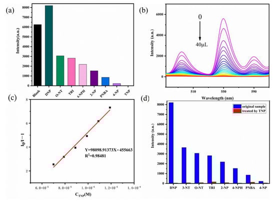 Picric acid (PA), or 2,4,6-Trinitrophenol (TNP), possesses three electron-withdrawing nitro groups and one electron-donating hydroxyl group on a benzene ring. As a common and typical malignant organic pollutant, TNP is used widely in industries for dyes, explosives, pharmaceuticals, fireworks, firecrackers and leather. High toxicity, and harmfulness to eyes, skin and the respiratory system inspired many researchers to efficiently detect TNP. The traditional detection methods, including HPLC, RS, IMS, GC, MS and MIT, could be used to detect explosives, such as TNP; some potential limitations of these technologies restrict their application [64]. TNP remains in a dissociated form in solution and can interact with the positive center on the fluorophore due to its low pKa value (pKa = 0.42) [35,65]; thus, the fluorescence sensing method is suitable for the detection of TNP in solution.