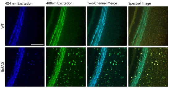 Brain sections from 9-month-old WT and 5xFAD mice stained with 1% ThS. The fluorescence emission of ThS provides more information when imaged in spectral mode than dual-channel imaging. Dual-channel images were collected with the DAPI and FITC emission filters and compared with spectral true-color images (right). Bright staining of the white matter (corpus callosum) prevented the identification of plaque pathology when imaged with one channel. Spectral imaging showed differential spectra of the white matter and plaque staining and also revealed faint, reddish cell bodies throughout the cortex. Scale bar: 200 μm.
