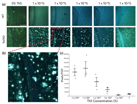 In this study, we investigated the sensitivity with which ThS can detect β-amyloids in the 5xFAD Alzheimer’s mouse model. This transgenic mouse was created by inserting five genes for the accelerated deposition of β-amyloid in the brain and spontaneously develops robust amyloid plaque pathology in a predictable, age-dependent manner [31,32]. We developed an optimized ThS staining protocol with controlled dye concentrations that enabled a more effective visualization of amyloid pathology in the brain of young and old 5xFAD mice than traditional staining protocols using this dye. Additionally, spectral imaging of the ThS-stained tissues yielded more biologically relevant information than traditional fluorescence imaging, and together with advanced analytical methods, enabled the detection of subtle and widespread protein misfolding in the 5xFAD brain.