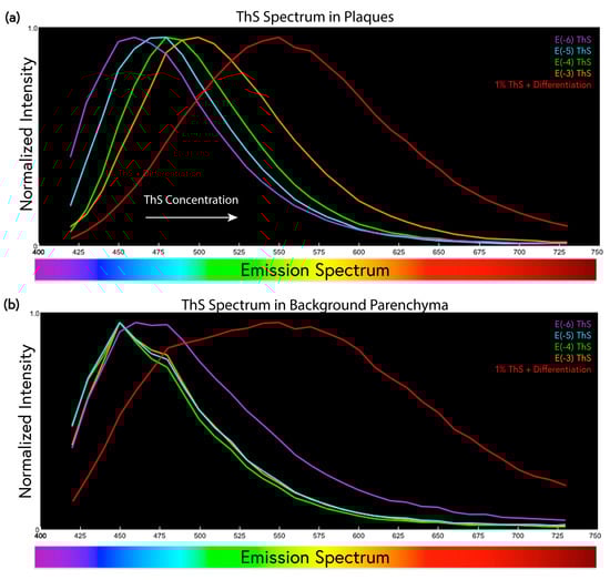 The emission spectrum of the dye in the plaques and background parenchyma also changed as a function of concentration. From the lowest concentration tested (1 × 10−6%) to the traditional 1% staining, there was a substantial 90 nm shift in the peak emission spectrum of the plaques (Figure 4a). This could be due to the heterogeneity of the compounds present in the ThS, which may contribute more to the fluorescence emission at higher concentrations, or due to molecule–molecule interactions within the amyloid plaque pockets, e.g., the formation of excimers at higher ThS staining concentrations. These phenomena should be taken into careful consideration when optimizing ThS and other probes for the optimal detection of amyloids in tissue samples.