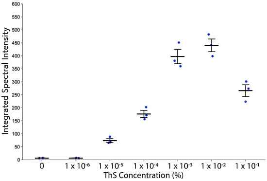 Integrated spectral intensity of plaque cores as a function of ThS concentration. Adjacent 5xFAD brain sections from the same mouse stained with various concentrations of ThS were all imaged with the same instrument settings. Plaque regions were selected in the images and the integrated spectral intensity was calculated. Maximum fluorescence intensity was achieved at 1 × 10−2% and unexpectedly diminished at the highest concentration tested. Error bars represent SEM.