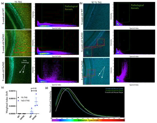 Given that 1 × 10−5% ThS was found to be the most sensitive for subtle pathology in aged 5xFAD mice, this optimized protocol was then applied to 5-week-old 5xFAD and WT mice. Typically, 5xFAD mice begin to develop amyloid pathology at around 6 weeks of age [31]. In staining the tissues of even younger mice, we sought to test the sensitivity of ThS staining for very early, diffuse pathology by comparing 1% ThS + differentiation vs. 1 × 10−5% ThS staining per our protocol. The conventional 1% differentiation staining of the 5-week-old mouse brains did not reveal any pathological features visually (i.e., no obvious plaques were visible at this young age), and neither were any pathological features visible with spectral scatter analysis (Figure 6a). With 1% ThS, plaque pathology only became apparent once the 5xFAD mice were 9 weeks old. In contrast, 1 × 10−5% ThS revealed occasional cortical deposits with spectra very similar to those of amyloid plaques in the 5-week-old mice (Figure 6b,c). Upon examination of the brain tissues of the 9-week-old mice with 1 × 10−5% ThS, not only were plaques apparent in the cortex, but white matter threads were also visible in the corpus callosum. The emission spectra of the plaques were examined in both the 5-week-old and 9-week-old mice. The plaques red-shifted as the age of the mouse increased (Figure 6d).