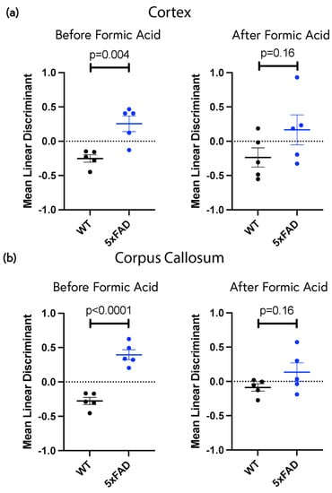 Linear discriminant analysis reveals significant spectral differences in background of 9-month-old WT vs. 5xFAD brain stained with 1 × 10−5% ThS that is sensitive to formic acid treatment. Linear discriminants were calculated from the spectrum of each image kernel, then averaged for each mouse and plotted. Higher linear discriminant values indicate a more pathological state. (a) Cortical background excluding all plaque regions. (b) Corpus callosum. Each dot represents a different mouse. p values calculated using Student’s t-test.