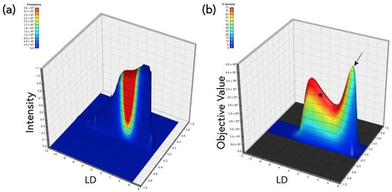 (a) Example surface plot representing a histogram of kernel-wise linear discriminants calculated from spectral micrographs of WT and 5xFAD mouse brains stained using 1 × 10−5% ThS. Regions of interest were scanned across 10 such surfaces (n = 5 for WT and n = 5 for 5xFAD) in an automated fashion, and inter-group statistics were calculated in an effort to identify smaller subpopulations of kernels (the pixels in the images) that exhibit even greater WT vs. 5xFAD differences. The result of such a surface scan is shown in (b). Two distinct peaks can be observed, the first (*) representing the bulk of the kernel population, and the second representing a smaller subpopulation of kernels (arrow) with a higher objective value (greater inter-group statistical difference). All plotted solutions had inter-group differences at the p < 0.05 level, but the peak solution showed a WT vs. 5xFAD difference at p = 0.0035 (Student’s t-test).