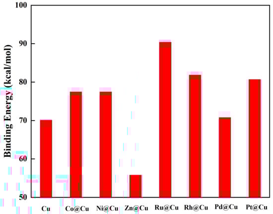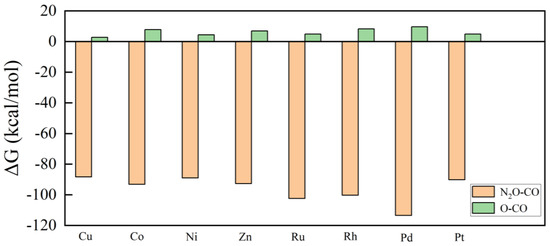 where ΔE and ΔEZPE are the calculated DFT total energy, calculated zero-point energy, and entropic corrections (TS) at T = 298.15 K. For gas phase molecules, the values of ZPE and S came from the NIST database [50]. The ΔG, ZPE, and S of the reactant by the thermodynamics systems were calculated (Tables S2 and S3). The reaction occurred readily under ambient conditions in the case of the M13@Cu42 cluster clusters (except for Pd13@Cu42), as shown in Figure 6.