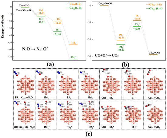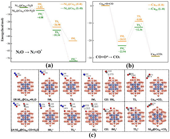 Under the L-H mechanism, N2O and CO were first co-adsorbed (*N2O–*CO) on the catalyst surface, bonding to the underlying two adjacent Cu atoms. Subsequently, the N2 was desorbed from the active sites to generate a gaseous N2 molecule, and the remaining O atoms were adsorbed on the Cu55 cluster. The average distance between *C and Cu was 1.84 Å, and the N–O bond length was 3.04 Å. The adsorption energies of the co-adsorbed CO and N2O molecules for the eight types of catalysts were calculated to range from −72.87 to −97.77 kcal/mol. The remaining O atom approached an adsorbed CO molecule and reacted to form CO2, which was also exothermic. The adsorption energies of the CO and absorbed O atom ranged from −0.92 to −7.61 kcal/mol. The barrier of the transition state (TS2+) for the formation of *O*CO ranged from 9.68 kcal/mol to 19.58 kcal/mol. The transition state involved *O and *CO adsorbates having a distance of 1.93–2.27 Å between them for the M13@Cu42 clusters. The CO2 molecule was directly dissociated from the M13@Cu42 clusters, indicating the accomplishment of the reaction. By examining the overall CO oxidation as a result of N2O processes via the L-H mechanism, the CO oxidation step was considered as the rate-limiting step in the eight catalysts (M13@Cu42 clusters), which was consistent with the results of the Cun (n = 4–15) clusters [28]. Before the rate-limiting step, the barriers for the N2O reduction steps on these eight catalysts were relatively exothermic and barrierless. The released energy ranged from −72.87 to −97.77 kcal/mol for the exothermic reaction of N2O reduction. As shown in Figure 3 and Figure 4, the Cu55 and Ni13@Cu42 clusters of catalysts successfully produced N2 and CO2 with barrier energies of 10.58 and 9.68 kcal/mol, respectively. Notably, the Ni13@Cu42 cluster possessed the lowest barrier for catalyzing the CO oxidation by the N2O reaction.
