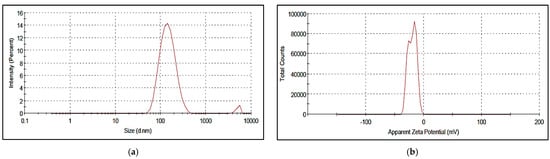 As suggested by Cui et al. [25], liposomes with smaller particle sizes (<200 nm) can achieve a high utilization ratio in terms of the entrapped compound. The surface zeta potential is a vital parameter that characterizes the dispersibility and stability of liposome systems. The higher zeta potential provides a repelling force between the particles, thus increasing the stability of the liposomes [26].