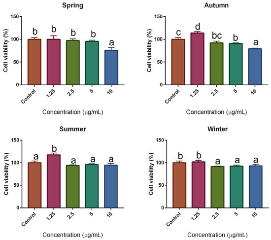 Cytotoxic effect of seasonal SPE on RAW 264.7 cells. Bars with different superscripts indicate statistical differences (p ≤ 0.05). All values represent the mean ± SD of at least three independent experiments performed in triplicate (n = 3).