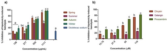 Effect of (a) seasonal SPE and (b) SPC on inhibition of hypotonicity-induced hemolysis. Values represent means ± SD of three independent experiments (n = 3). Bars with different letters within the same group of concentration indicate statistical differences (p ≤ 0.05).
