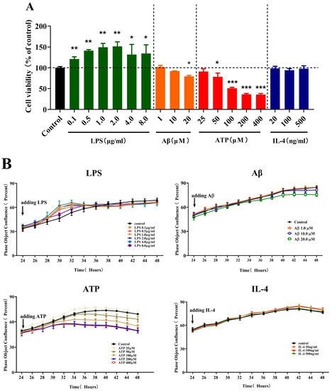 To assess the effects of different stimulations on the cell viability of microglia, we carried out a CCK-8 assay following treatment with LPS, Aβ, ATP or IL-4 for 24 h in BV-2 cells. In the presence of different stimulations, the cell viability of the microglia changed variously, as shown in Figure 1A. LPS significantly increased the cell viability in the concentration range of 0.1 (p < 0.01), 0.5 (p < 0.01), 1.0 (p < 0.01), 2.0 (p < 0.01), 4.0 (p < 0.05) and 8.0 µg/mL (p < 0.05). In addition, Aβ significantly decreased the cell viability at a concentration of 20 µM (p < 0.05), as well as ATP in the concentration range of 50 (p < 0.05), 100 (p < 0.001), 200 (p < 0.001) and 400 µM (p < 0.001). By contrast, IL-4 in the concentration range of 20, 100 and 500 ng/mL showed no prominent effects on the cell viability.