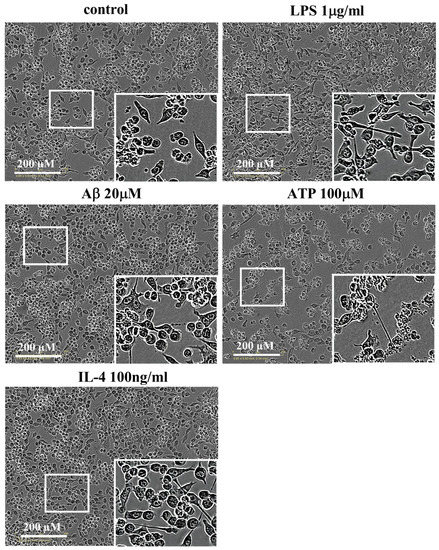 Based on the above results, we found that the cell viability and the fusion rate of microglia became stronger when treated with 1 µg/mL LPS, and these became weaker when treated with 20 µM Aβ and 100 µM ATP. Therefore, we used 1 µg/mL LPS, 20 µM Aβ and 100 µM ATP in the following experiments to observe the changes in morphology. In addition, IL-4 had no impact on the microglial cell viability and fusion rate, hence we used 100 ng/mL IL-4 in the following experiments for observing the changes of morphology, according to the previous research [17].