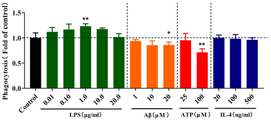 Effects of different stimulations on the phagocytosis of microglia. The BV-2 cells were treated for 24 h in vehicle controls or following treatment with 0.01, 0.1, 10.0 and 20.0 µg/mL LPS, 1, 10 and 20 µM Aβ, 25 and 100 µM ATP and 20, 100 and 500 ng/mL IL-4 in BV-2 cells for 24 h. Data are presented as mean ± S.D. * p < 0.05, ** p < 0.01, compared with the control group under the same condition; one-way ANOVA with Dunnett’s multiple comparison test for more than two groups, n = 3 for each experimental group. p < 0.05 was considered significant.