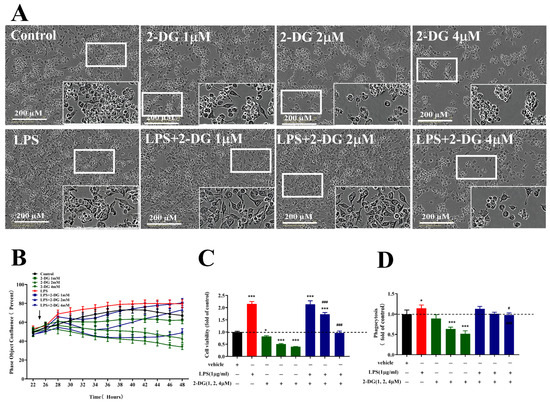Effects of 2-DG on the morphology (A), fusion rate (B), cell viability (C) and phagocytosis (D) in the presence or absence of LPS (1 µg/mL) in microglia. BV-2 cells were pretreated with 2-DG (1, 2, 4 µM) for 2 h and stimulated LPS (1 µg/mL). Data are presented as mean ± S.D., n = 4. * p < 0.05, *** p < 0.001, compared with control group under the same conditions; # p < 0.05, ### p < 0.001, compared with LPS 1 µg/mL group under the same condition; analyzed by one-way ANOVA with Dunnett’s multiple comparison test for more than two groups. p < 0.05 was considered significant.