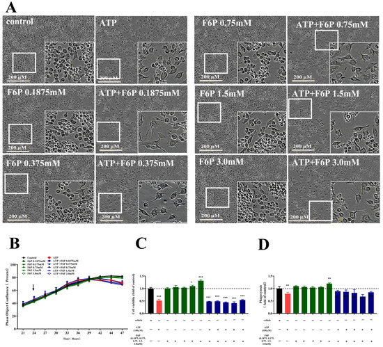 We found that there was no change in the morphology of the BV-2 cells with F6P treatment (0.1875–3.0 mM) compared with untreated control, as shown in Figure 6A, as well as the fusion rate, as shown in Figure 6B. However, the cell viability and phagocytosis of BV-2 cells significantly increased with F6P treatment at 1.5, 3 mM (p < 0.05, p < 0.001) or 3.0 mM (p < 0.001,), indicating that F6P promoted the glycolysis of the microglia in the quiescent state, as shown in Figure 6C,D. As shown in Figure 5A–D, the ATP activation of BV-2 cells drove the change of morphology with irregular cell bodies and the decreased number of cells, as well as the reduction in the fusion rate, cell viability (p < 0.001) and phagocytosis (p < 0.01), all of which were not improved by F6P treatment (0.1875–3.0 mM) in ATP-exposed BV-2 cells (Figure 6A–D). These data demonstrate that the cell type response of the microglia induced by ATP was not improved by promoting glycolysis.