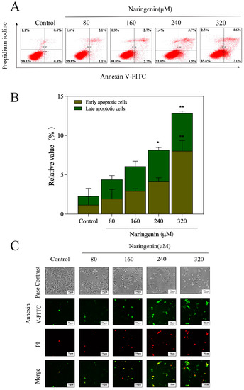 As mentioned earlier, HepG2 cells were stained with Annexin V-fluorescein isothiocyanate and PI according to the protocol included in the Annexin V-PI kit [40]. In brief, cells were treated with naringenin for 24 h. After the cells were washed with PBS, they were collected in a centrifuge tube and centrifuged at 1500 rpm for 5 min, and the original culture medium was removed. Next, the Annexin V-FITC binding solution, Annexin V-FITC, and PI were added and mixed well, and then stored at room temperature in the dark for 20 min. Finally, the cells were analyzed using flow cytometry. The condition of cell death was detected using a flow cellometer (Ex = 488 nm; Em = 530 nm). In addition, after the adherent cells were stained with Annexin-V/PI in a 6-well plate, they were observed in situ under a fluorescence microscope [41].