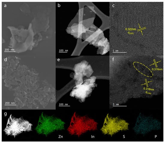 Morphology and microstructure analysis of the pure ZIS and P-ZIS-1.0: SEM images of (a) pure ZIS and (d) P-ZIS-1.0; TEM and HRTEM images of (b,c) pure ZIS and (e,f) P-ZIS-1.0; (g) EDS elemental mapping of P-ZIS-1.0.