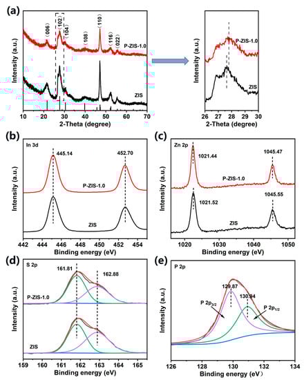 (a) XRD patterns of the pristine ZIS and P-ZIS-1.0; XPS survey spectra of ZIS and P-ZIS-1.0: (b) In 3d; (c) Zn 2p; (d) S 2p; and (e) P 2p.