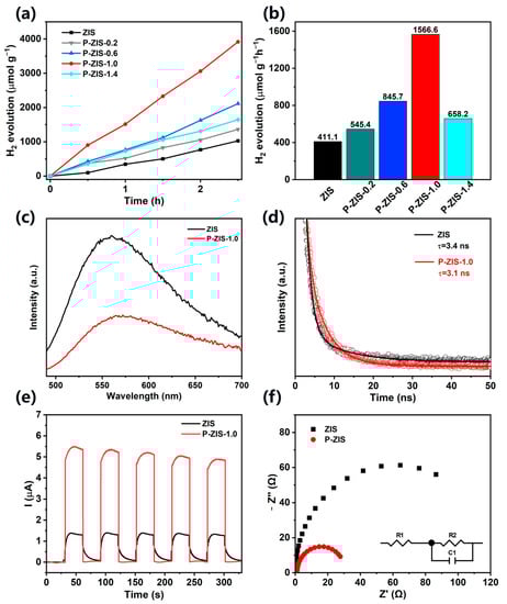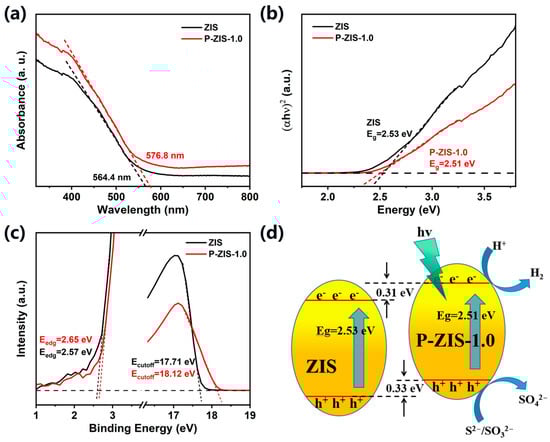 The energy level diagram of pure ZIS and P-ZIS-1.0 plotted based on band gaps and energy levels is shown in Figure 4d. According to the above-mentioned characterizations and analysis, the enhanced photocatalytic performance of the P-ZIS-1.0, as compared to the pristine ZIS can be attributed to the promotion of charge separation and effective inhibition of electron-hole recombination during the photocatalytic process. P-ZIS-1.0 has better carrier transfer ability and a smaller bandgap. Moreover, the upward movement of the CB edge of P-ZIS-1.0 indicates that it has a stronger reduction ability and can better carry out reduction reactions, enabling the reaction to proceed forward [52,53]. The comprehensive synergistic effect of the above advantages contributes to the improvement of the photocatalytic hydrogen production efficiency over P-ZIS-1.0.
