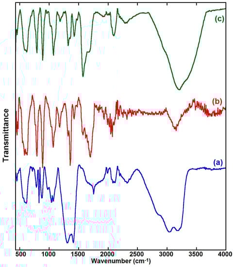 Figure 1 shows: (a) the FT-IR spectra of the iron oxide (F); (b) the iron oxide-hydrochar composite (FHC); and (c) the iron oxide-activated hydrochar composite (FAC), which were synthesized using the microwave-assisted hydrothermal carbonization technique. The formation of iron oxide is confirmed in the three samples as the three spectra show vibrations at about 457 cm−1 and 550 cm−1, which may be referred to as the tetrahedral and octahedral Fe-O of magnetite. Moreover, the vibrations at 610 cm−1 and 880 cm−1 may be referred to as maghemite and goethite, respectively [32,33].