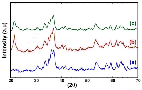 Figure 2 represents the XRD diffractograms of: (a) the iron oxide; (b) the iron oxide-hydrochar composite; and (c) the iron oxide-activated hydrochar composite prepared through MHC treatment. In Figure 2a, the peaks at 2Ɵ = 30.70°, 36.2°, 41.9°, 53.29°, 57.47°, and 61.65° can be ascribed to the crystalline planes (200), (311), (400), (422), (511), and (440) of magnetite, according to JCPDS file no: 00-003-0863. Magnetite is an inverse spinel structure with a face centered cubic lattice [9,32]. The diffraction peaks at 2Ɵ = 33.46°, 35.11°, 36.81°, 40.30°, and 53.29° can be assigned to (301), (201), (111), and (212), respectively, of goethite, according to JCPDS file no: 29-0713. Goethite is an orthorhombic structure of α-FeOOH [34].