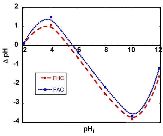 Figure 5 shows the initial pH on the X-axis and ∆pH on the Y-axis. The intersection between the curve and the x-axis is the pH of the point of zero charge (PZC). The pH of the PZC of the iron oxide-hydrochar composite and iron oxide-activated hydrochar are 5.3 and 5.6, respectively. The pH of the PZC represents the pH at which the surface charge of the adsorbent is zero. If the pH of a solution is lower than the pH of the PZC, the surface charge is positive, and vice versa. The adsorption experiment in this work was executed at pH 8. This pH was chosen to avoid the electrostatic repulsion between the cationic MB dye and the positive surface of the FHC and FAC at a pH less than 5 [37,38]. Moreover, it is recommended to carry out the adsorption of cationic dyes at a higher pH than the pH of the point of zero charge (PZC) of adsorbents in order to reduce the competition between protons and cationic dyes [39].