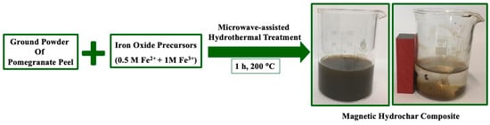 Despite all the advantages of adsorption, there is still one challenge regarding the ease of collecting the adsorbents after the adsorption process is completed. One way to solve this issue is adding magnetic properties to the hydrochar, which can be added in a consecutive way or a simultaneous way [9]. In the consecutive method, hydrochar is prepared, then the magnetic material is added, which may be a metal or a metal oxide. This method sometimes results in blocking the pores, and the magnetic materials can be leached out [9,16]. In the simultaneous way, the magnetic precursor is added to the hydrochar during the synthesis [17]. In this method, the magnetic material is not only on the hydrochar surface, but it is well-dispersed through the hydrochar [18,19].