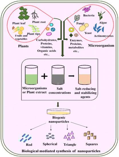 The green-mediated approach to obtaining NPs is differentiated, but organisms or their extracts are easily responsive to metallic salt, and biological stabilization was analyzed to turn metal into NPs. The formation of nanoparticles by organisms was a green method that used fungi, bacteria, and viruses’ enzymes and secondary metabolites. These kinds of organisms provide primary substances for the synthesis and manipulation of better-organized nanoparticles [39]. For differentiation, the microbially mediated obtaining method was a significant one, and plants might be applied as a beneficial method for nanoparticle formation. For obtaining nanoparticles, it might be easier to use plant extracts. Furthermore, plant extracts may reduce metallic ions, allowing microbes to easily form and stabilize metallic nanoparticles [40,41]. Plant extracts and various components such as proteins, polysaccharides, amino acids, and phytochemicals such as flavonoids, alkaloids, tannins, and polyphenols are appearing that might stabilize and reduce the nanoparticles (Figure 3).