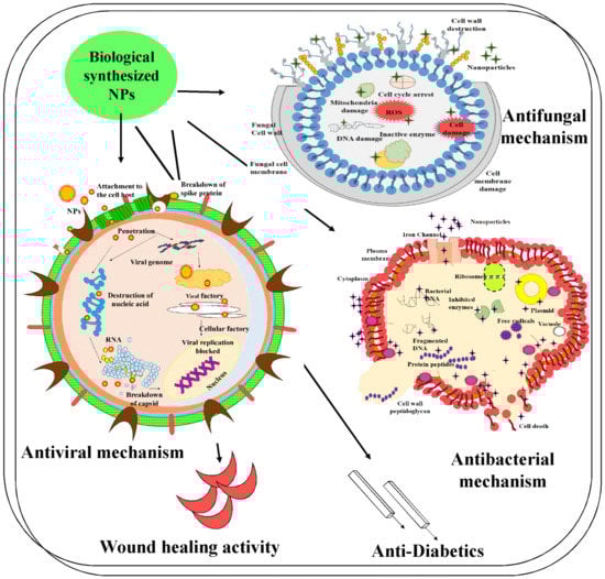 Copper iodide nanoparticles of around 160 nm were found to inhibit the Feline calicivirus infection by ROS generation and also by the oxidation of capsid proteins [21]. Cuprous oxide nanoparticles of around 45 nm were found to inhibit the Hepatitis C virus infection by preventing the HCV virus’s entry through attachment mechanisms [21]. Iron oxide nanoparticles of 10–15 nm were also found to be very effective in inhibiting the H1N1 influenza virus infection by inactivating the cellular proteins by interacting with the proposed -SH functional group [21]. ZnO nanoparticles of 16 to 20 nm were also found to be effective against H1N1 influenza, which inhibits the proliferation of the virus [21]. Up until now, various metal nanoparticles have been obtained and analyzed for their different biomedical applications. Hence, in this review, we describe the various synthesis methods for NPs and their biological mechanisms to feature their various biomedical applications.