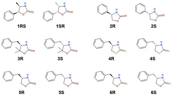Enantiopure (4R,5S)-4-Methyl-5-phenyl-2-oxazolidinone (1RS), (4S,5R)-4-Methyl-5-phenyl-2-oxazolidinone (1SR), (R)-4-Phenyl-2-oxazolidinone (2R), (S)-4-Phenyl-2-oxazolidinone (2S), (R)-4-Benzyl-5,5-dimethyl-2-oxazolidinone (3R), (S)-4-Benzyl-5,5-dimethyl-2-oxazolidinone (3S), (R)-4-benzylthiazolidine-2-thione (4R), (S)-4-benzylthiazolidine-2-thione (4S), (R)-4-Benzyl-2-oxazolidinone (5R), (S)-4-benzyl-2-oxazolidinone (5S), (R)-4-benzyloxazolidine-2-thione (6R), and (S)-4-benzyloxazolidine-2-thione (6S) were purchased from Sigma-Aldrich Hungary (Budapest, Hungary).