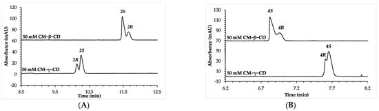 No separation occurred for the enantiomers of compound 2 when using CM-α-CD, even up to a chiral selector concentration of 50 mM. On the other hand, as shown in Figure 2A, when using CM-β-CD, the migration order was 2S, followed by 2R, while upon changing to the larger cavity-sized selector (CM-γ-CD), EMO reversal was observed, 2R being the first migrating enantiomer. A similar trend was observed for the thio-analog, compound 4, where EMO reversal was observed when changing the chiral selector from CM-β-CD to CM-γ-CD (Figure 2B).