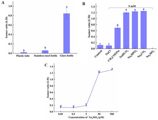 Effect of (A) container material (B) weak acid ions and (C) Na2SiO3 concentration on amygdalin isomerization. Different letters indicate significant differences (p < 0.05). Note: in the Na2SiO3 treatment group, no amygdalin was detected.