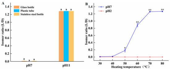 The interaction of temperature, pH, and container material on amygdalin isomerization is further investigated. As seen from Figure 3A, when incubated at room temperature, the isomer ratio of amygdalin in all containers is very low and statistically identical under neutral conditions, indicating that container material is unimportant under those conditions. At pH 11, the isomer ratio of amygdalin in all containers is very high and statistically identical, indicating that under these conditions, container material is unimportant, but an alkaline pH promotes isomerization. (Figure 3B) Incubating amygdalin in glass tubes at temperatures ranging from 30 to 80 °C at neutral and acidic pHs, the D/L isomer ratio increased with temperature only in the neutral condition. At pH 2, there was no L-amygdalin formed at any temperature. The free H+ at pH 2 neutralizes the OH− groups on the amygdalin benzyl ring, rendering the molecule a higher degree of stability. In summary, at room temperature the isomerization of amygdalin only occurred under alkaline conditions, while at elevated temperatures, isomerization could also occur under neutral conditions, though not under acidic conditions.