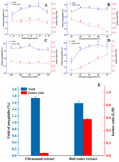 Single factor experiments: ultrasonic extraction parameters affect the yield and isomer ratio of amygdalin extracted from peach kernels. (A) solid-to-liquid ratio; (B) ethanol concentration; (C) ultrasonic power; (D) ultrasonic temperature. Different letters indicate significant differences (p < 0.05). (E) Comparison of amygdalin yield and isomer ratio from the ultrasonic and boiling water extraction methods. Note: ultrasonic extraction: solid to liquid was 1:25 (w/v), ultrasonic power was 432 W, ultrasonic temperature was 40 °C, and ethanol concentration was 80%. Boiling water extraction: solid to liquid was 1:25 (w/v), incubation temperature was 100 °C.