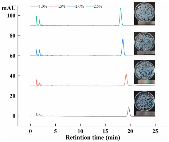 When sodium alginate–amygdalin hydrogel beads were heated at 80 °C for 30 min, the isomerization of amygdalin was expressed as thermal stability. As shown in Figure 8, it can be seen that L-amygdalin was not detected in the four concentrations of hydrogel beads after heating. This indicates that the preparation of sodium alginate-loaded amygdalin hydrogel beads can effectively avoid the isomerization of amygdalin at high temperatures. It has been reported that alginate hydrogel beads can improve the thermal stability of some substances [38,39].