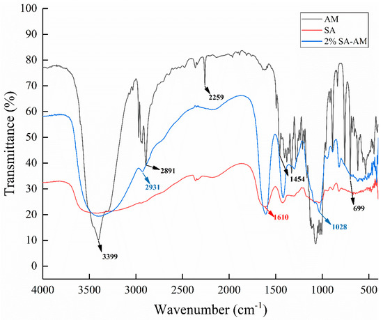 FTIR of amygdalin, sodium alginate, and 2% sodium alginate–amygdalin hydrogel beads.