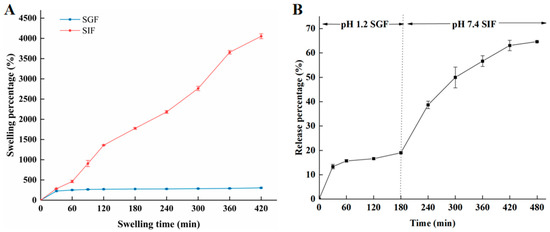 As shown in Figure 10A, after 420 min, the swelling percentage of hydrogel beads in SIF reached 4054%, while the swelling percentage in SGF was only 305%. This was mainly due to the fact that the strength of hydrogen bonding between COOH and OH groups from the alginate polymeric chain weakened in SIF solution. The COOH in the hydrogel beads were ionized into COO- [40]. Furthermore, the increase in COO- will produce electrostatic repulsion, disturbing the integrity of the hydrogel beads by loosening the structure of the hydrogel beads. Finally, more water molecules infiltrated into the beads. Compared with the swelling degree in SIF, the swelling degree in SGF is low. This may be due to conversion COO- into COOH groups under acidic condition [41]. On the other hand, in SGF solution, as shown in Figure 10B, the release of amygdalin was relatively slow, and the release rate was about 20% after reaching stabilization. In SIF solution, the release gradually increased during digestion; consequently, the release rate of amygdalin reached 64.65% at 480 min. The release effect in SIF was significantly higher than that in SGF solution, which was also consistent with the swelling behavior. During the release process in SIF solution, amygdalin was dissolved and then diffused through the swelling process [40]. The low swelling effect of SGF was obviously not conducive to the release of amygdalin. This indicates that the prepared amygdalin–sodium alginate hydrogel beads can sustain relative stability in SGF, and simultaneously, amygdalin could be released in the SIF, which was meaningful for adsorption and utilization.