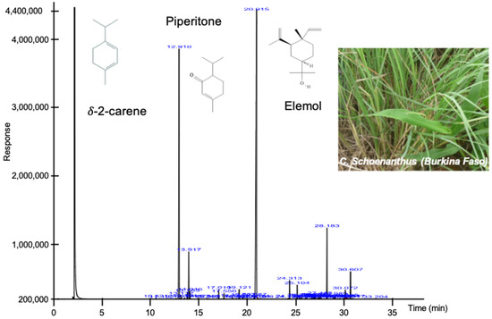 Chromatogram of identified compounds of C. schoenanthus EO. Structures of the three major identified compounds are drawn. Essential oil was extracted by hydrodistillation using an alembic/Clevenger-type apparatus for 3 h and stored in the bottle at 4 °C. Inset, photograph of Cymbopogon schoenanthus taken by Dr. Bagora BAYALA in Ouagadougou, Burkina Faso. GPS location: 12°25′29.5″ N and 1°29′14.3″ W.