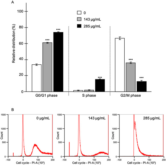 Effect of C. schoenanthus EO on LNCaP cell cycle. (A) LNCaP cells were incubated with control (DMSO 1/1000) and without EO (0 µg/mL) or with EO (142 or 285 μg/mL) diluted in DMSO for 72 h. Values are expressed as mean values ± standard deviation; n = 3 independent experiments in triplicate; ***, p < 0.001 values significantly different compared to vehicle-treated condition; EO, essential oil. Flow cytometry plots are shown in (B).