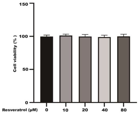 After incubating the Caco-2 cells with different concentrations of resveratrol (10, 20, 40, and 80 μM) for 24 h, a CCK-8 kit was used to detect the viability of the Caco-2 cells. The results showed that resveratrol had no significant effect on the activity of the Caco-2 cells at 24 h (Figure 1).