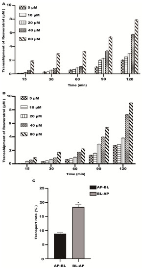 The transport of resveratrol with different concentrations (5~80 μM). (A) The transport of resveratrol in the AP–BL. (B) The transport of resveratrol in the BL–AP. (C) The transport rate of resveratrol. * p < 0.05 compared with AP-BL side.