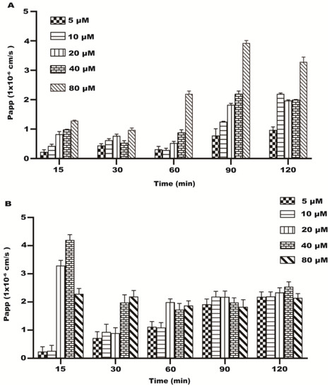 The Papp of each concentration (5~80 μM) of resveratrol during 120 min. (A) The Papp of AP–BL. (B) The Papp of BL–AP.