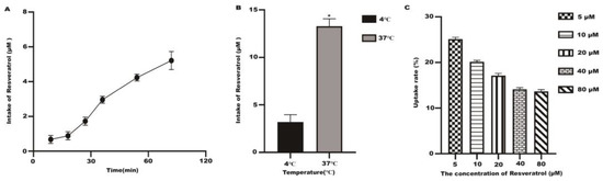 The uptake of resveratrol with different concentrations (5~80 μM). (A) The uptake of resveratrol (80 μM) at different times. (B) The uptake of resveratrol at different temperatures. (C) The uptake rate of resveratrol of Caco-2 cells. * p < 0.05 compared with 4 °C.