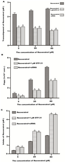The effect of STF-31 and siRNA on resveratrol transport and uptake in Caco-2 cells. (A) The transport of different concentrations of resveratrol. (B) The Papp of each concentration of resveratrol. (C) The intake of different concentrations of resveratrol. * p < 0.05 compared with the resveratrol group.