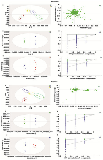 Three experimental groups were analyzed with unsupervised PCA in this study. Positive and negative modes explained 86.8% and 72.6% of the total variance, respectively. The PCA plots (Figure 8A,B,G,H) showed clear separation between the three groups in both positive and negative ion modes. We used supervised orthogonal partial least squares discriminant analysis (OPLS–DA) to separate and identify the metabolites further. The OPLS–DA score plots clearly distinguished the H2O2 group from the other groups without any overlap in either positive or negative modes (Figure 8C,E,I,K). Based on the R2X, R2Y, and Q2 values, the OPLS–DA model was robust and predictive (Figure 8D,F,J,L).