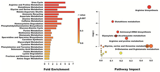 Overview of altered concentrations of metabolites and related metabolic pathways.